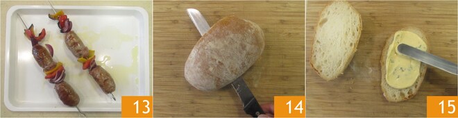 Une fois cuites, retirez les brochettes du bbq 13. Prenez le pain et coupez-le en deux 14. Garnissez un côté avec la mayonnaise 15.