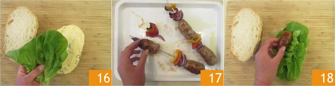 Ajoutez une feuille de laitue dessus 16. Retirez les verzini et les légumes des brochettes 17, puis garnissez les sandwiches avec la viande 18 et les légumes.