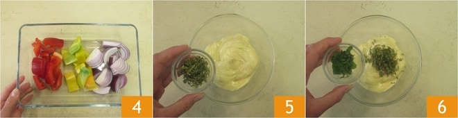 Mettez de côté les légumes 4. Versez la mayonnaise dans un bol, parfumez avec des feuilles de thym 5 et de l'origan frais 6.