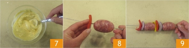 Mélangez pour parfumer 7. Formez les brochettes : enfilez d'abord un verzino, puis les légumes 8 et alternez pour compléter les brochettes 9.