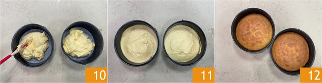 Divisez ensuite la pâte en parts égales et versez-la dans 2 moules de 18 cm de diamètre, préalablement beurrés et farinés 10. Vous pouvez tapisser le fond avec du papier cuisson et ne beurrer que les bords. Nivelez la surface avec une spatule pour répartir la pâte de manière uniforme 11. Faites cuire dans un four statique préchauffé à 180 pendant environ 25 minutes, jusqu'à ce que les fonds soient dorés et cuits à cœur. Faites le test du cure-dent avant de les sortir 12, puis laissez-les refroidir complètement.