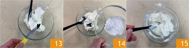 Une fois froids, préparez la crème : versez le fromage à tartiner Philadelphia dans un bol, ajoutez les graines extraites de la gousse de vanille 13 et le sucre glace tamisé 14. Mélangez avec une spatule ou avec les fouets jusqu'à obtenir une crème lisse, veloutée et sans grumeaux 15.