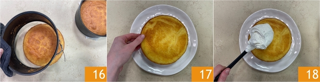 À ce stade, démoulez les fonds 16 et placez le premier sur un plat de service en le retournant 16. Étalez sur la surface une couche généreuse de crème au fromage 18, en lissant délicatement.
