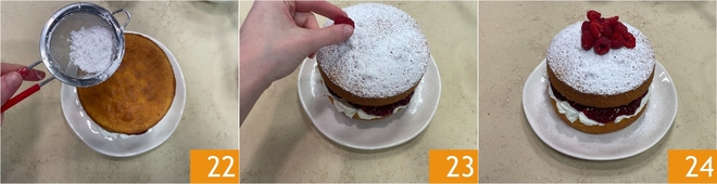 Terminez en saupoudrant la surface d'une cuillère à soupe de sucre glace 22 et décorez avec les framboises fraîches restantes, en les disposant au centre 23. Le Victoria Sandwich est prêt à être servi !