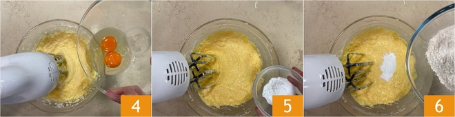 Ajoutez ensuite les œufs, un à un 4, en vous assurant qu'ils soient à température ambiante. Incorporez la levure tamisée 5 et la farine tamisée 6.