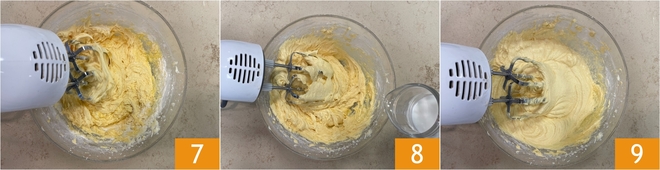 Mélangez bien avec les fouets 7, puis versez le lait en filet 8 et travaillez encore jusqu'à obtenir une pâte lisse, homogène et bien montée 9.