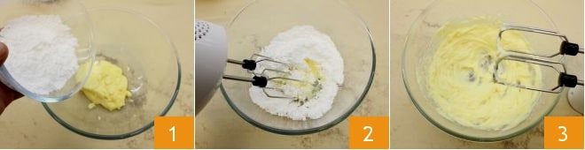 Pour préparer les biscuits viennois au double chocolat, travaillez le beurre avec le sucre glace à l'aide d'un batteur électrique (1-2), jusqu'à obtenir une pâte mousseuse 3.