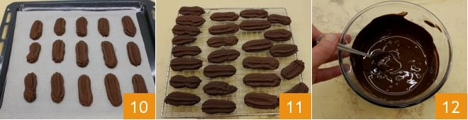 placés à quelques centimètres les uns des autres 10. Enfournez les sablés dans un four statique préchauffé à 180° pour environ 12 minutes (160° pour environ 6-8 minutes si four ventilé). Avec ces doses, vous obtiendrez environ 30-35 sablés. Une fois cuits, sortez-les du four et laissez-les refroidir sur une grille 11 ; pendant ce temps, faites fondre le chocolat au micro-ondes ou au bain-marie (dans ce cas, l'eau de la casserole sur le feu ne doit pas toucher le fond du récipient ou de la casserole où vous faites fondre le chocolat). Une fois fondu 12