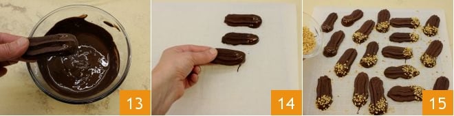 trempez une des extrémités de chaque sablé dans le chocolat 13 et placez-les sur un plateau recouvert de papier sulfurisé 14 ; puis saupoudrez chaque biscuit avec des éclats sur la partie avec le chocolat fondu 15. Laissez le chocolat fondu prendre à température ambiante et vos biscuits viennois au double chocolat sont prêts à être servis !