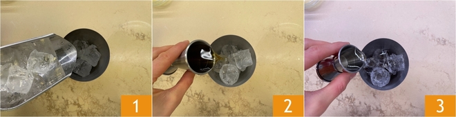 Pour préparer le whiskey sour, commencez par verser la glace dans le shaker 1 avec le whiskey bourbon 2 et le sirop de sucre 3.