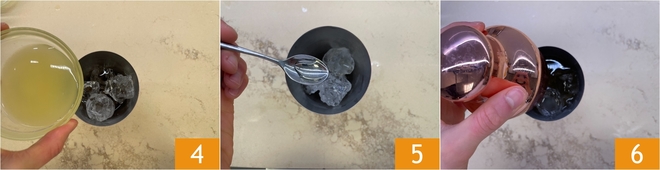 Filtrez le jus de citron et ajoutez-le aux autres ingrédients 4. Si vous le souhaitez, vous pouvez également ajouter quelques gouttes de blanc d'œuf pasteurisé 5. Fermez bien le couvercle et secouez vigoureusement le shaker 6.
