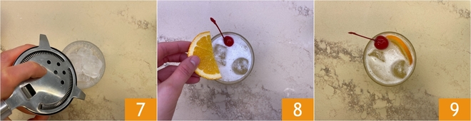 Filtrez le cocktail à travers le strainer 7 et remplissez les verres jusqu'au bord, puis garnissez avec une tranche d'orange 8 et une cerise au marasquin 9. Votre whiskey sour est prêt à être dégusté !