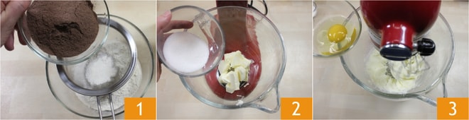 Pour préparer les whoopies au Nesquik avec crème à la stracciatella, commencez par préparer les petits gâteaux : mélangez dans un bol le Nesquik et la farine tamisée, la levure, la pincée de sel 1 et mettez-les de côté. Dans le bol d'un robot pâtissier équipé de fouets, vous pouvez également utiliser un batteur électrique, mettez le beurre qui doit être à température ambiante et le sucre 2, battez pendant quelques minutes puis ajoutez l'œuf 3,