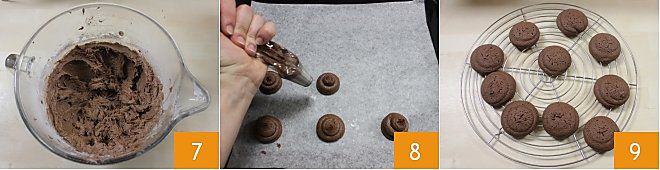 jusqu'à obtenir un mélange homogène 7. Mettez la pâte obtenue dans une poche à douille à embout lisse de 2 cm de diamètre. Pressez des petits tas de pâte d'environ 4 cm de diamètre sur une plaque recouverte de papier sulfurisé (vous devez obtenir des demi-sphères assez hautes) pour un total d'environ 15 tas par plaque 8. Enfournez dans un four statique préchauffé à 180° pendant environ 13-14 minutes (160° pendant 10 minutes en four ventilé), puis retirez les whoopies du four et transférez-les sur une grille 9. Laissez refroidir les whoopies.