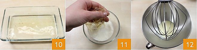 Pendant ce temps, vous pouvez préparer la crème à la stracciatella. Faites tremper la gélatine dans de l'eau froide pendant 10 minutes 10, puis essorez-la et faites-la fondre dans 50 ml de crème que vous aurez chauffée au micro-ondes 11. Dans le bol d'un robot pâtissier équipé de fouets, mettez le lait concentré Nestlé à température ambiante 12,