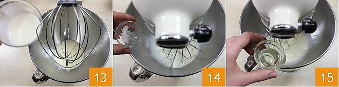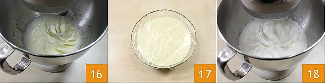 et actionnez les fouets pendant 5 minutes 16. Ensuite, transférez la crème dans un petit bol et couvrez-la avec du film alimentaire 17 et faites-la refroidir au réfrigérateur pendant 5 minutes afin qu'elle atteigne la même température que la crème que vous monterez ensuite. Cette étape est essentielle pour éviter de créer des grumeaux dans la crème. Prenez la crème froide et montez-la 18 avec un robot pâtissier équipé de fouets, ou avec un batteur électrique