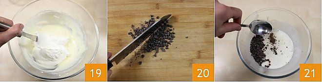 une fois montée en neige, ajoutez-la au mélange précédemment préparé et refroidi 19, en l'incorporant en tournant de bas en haut avec une spatule en caoutchouc pour ne pas faire retomber la crème. Hachez les pépites de chocolat avec un couteau 20 et ajoutez-les à la crème en mélangeant pour bien les incorporer 21.