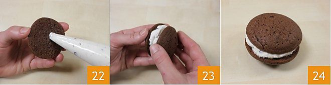 Il est maintenant temps d'assembler les whoopies au Nesquik, transférez la crème stracciatella dans une poche à douille jetable dont vous aurez coupé la pointe 22, ou équipée d'un embout lisse, et pressez la crème sur la face plate du petit gâteau et couvrez avec la face plate d'un autre biscuit 23. Continuez ainsi jusqu'à épuisement des ingrédients. Voici vos délicieux whoopies au Nesquik avec crème à la stracciatella prêts à être dévorés 24 !
