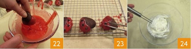 À ce stade, prenez 12 petits cœurs maintenant froids et plongez-les à moitié dans le glaçage 22, puis posez-les sur une grille et décorez-les avec 3 gouttes de chocolat chacune 23. Transférez le fromage crémeux dans un petit bol et travaillez-le avec une spatule pendant quelques minutes 24, puis transférez-le dans une poche à douille