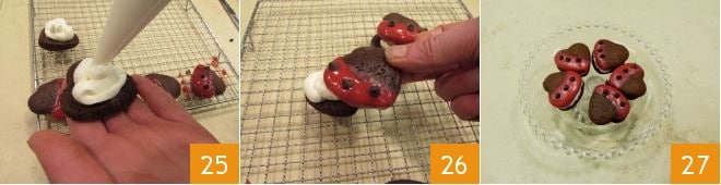 et utilisez-le pour garnir les 12 biscuits mis de côté précédemment 25. Terminez les whoopies de la Saint-Valentin en posant un petit cœur glacé sur un avec la crème 26, continuez ainsi pour les 12 whoopies et mettez-les au réfrigérateur pour qu'ils se raffermissent pendant environ 20 minutes, puis servez-les pour une Saint-Valentin vraiment spéciale 27 !