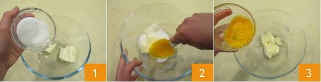 Pour préparer les whoopies de la Saint-Valentin, commencez par réaliser la pâte de base. Mettez le beurre à température ambiante dans un bol, ajoutez le sucre 2 et mélangez-le pendant quelques minutes avec une spatule 2 ou en utilisant une cuillère en bois. Une fois que vous avez obtenu un mélange plutôt homogène, ajoutez l'œuf légèrement battu 3