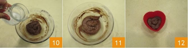 Seulement lorsque les farines sont bien incorporées, ajoutez le lait à température ambiante 10 et mélangez délicatement jusqu'à absorption 11. Une fois que vous avez obtenu un mélange lisse, dense et uniforme, transférez-le dans une poche à douille et déposez 10 g dans chaque moule en silicone en forme de cœur 12, vous devez en obtenir 24. Vous pouvez également utiliser une cuillère pour remplir vos moules, peut-être légèrement humidifiée pour éviter que le mélange ne colle à la cuillère.