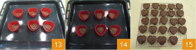 Frappez légèrement les moules sur une surface pour lisser la surface et placez-les sur une plaque de cuisson 13. Faites-les cuire dans un four statique préchauffé à 180° pendant 5 minutes, puis sortez-les 14 et laissez-les tiédir avant de les démouler, puis laissez-les refroidir complètement sur une grille 15.