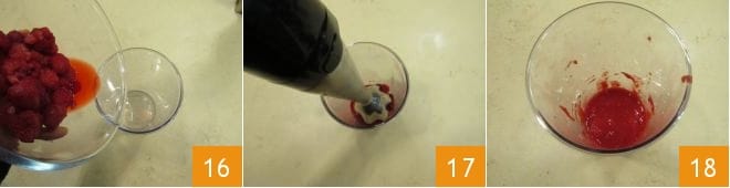 En attendant, préparez le glaçage rose. Versez les framboises dans un récipient à bords hauts et mixez-les avec un mixeur plongeant 17 pour obtenir une purée 18.