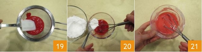 Pour avoir un mélange lisse, tamisez la purée obtenue dans un bol 19 : vous éliminerez ainsi les pépins. Pour en faire un glaçage, ajoutez le sucre glace petit à petit 20, en mélangeant avec un fouet jusqu'à obtenir un glaçage suffisamment dense 21.