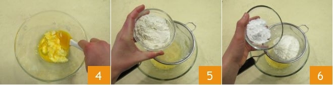 et continuez à mélanger 4 jusqu'à ce qu'il soit absorbé. À ce stade, tamisez directement dans le mélange la farine 5, la fécule 6, la levure
