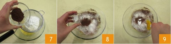 et le cacao en poudre 7. Ajoutez également le bicarbonate 8 et continuez à mélanger 9.
