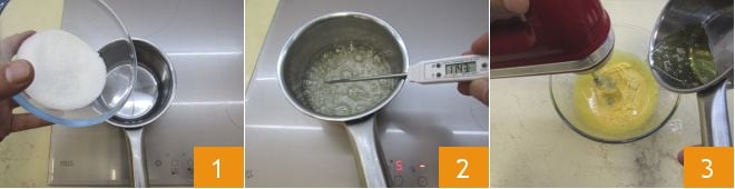 Pour préparer la woodland cake de panettone, commencez par la crème au mascarpone. Dans une petite casserole, versez l'eau et le sucre 1, mélangez et allumez la plaque de cuisson en portant la température à 121°C : pour cette opération, il est indispensable d'utiliser un thermomètre à pâtisserie 2. Lorsque le mélange atteint 115°C, versez les jaunes d'œufs dans un bol et commencez à les fouetter avec un batteur électrique. Une fois la température atteinte, versez le sirop en filet avec le batteur en marche 3.
