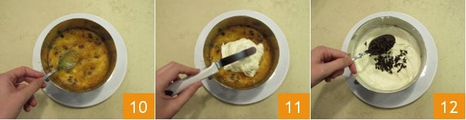 Étalez une couche épaisse de confiture d'oranges 10 puis une couche généreuse de crème en la répartissant soigneusement avec une spatule 11. Terminez le premier étage en saupoudrant de copeaux de chocolat 12.