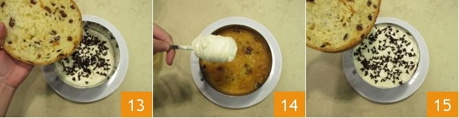 Et à ce stade, recommencez avec le panettone 13, la confiture, la crème 14 et enfin les copeaux. Sur la dernière couche de panettone 15.