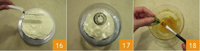 Versez encore un peu de confiture, puis le reste de la crème et lissez soigneusement 16. Recouvrez d'une cloche en verre et laissez au réfrigérateur pour raffermir pendant au moins une heure 17. Pendant ce temps, vous pouvez passer aux décorations. Attachez les bâtons de cannelle, de préférence les petits, avec de la ficelle alimentaire. Rincez et séchez les brindilles de myrte. N'oubliez pas non plus de nettoyer les petits animaux qui serviront à la décoration. Enfin, les physalis, badigeonnez-les de confiture 18.