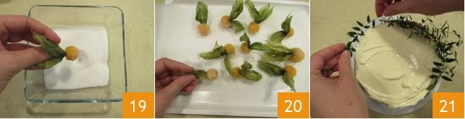 Puis roulez-les dans le sucre 19 et déposez-les petit à petit sur un plateau recouvert de papier sulfurisé 20. Après le temps écoulé, sortez le gâteau du réfrigérateur et retirez le cercle. Enfin, décorez le gâteau en commençant par le myrte qui sera disposé en demi-lune sur la surface 21.