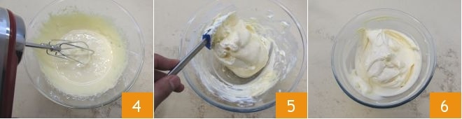 Continuez à fouetter jusqu'à ce que le mélange revienne à température ambiante 4. Éteignez le batteur et travaillez le mascarpone avec une spatule, cela vous permettra de l'assouplir avant d'ajouter la crème d'œufs 5. Recouvrez la crème au mascarpone de film plastique et laissez-la raffermir au réfrigérateur pendant au moins 30 minutes 6.