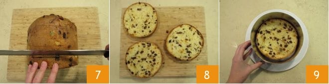 Entre-temps, occupez-vous du panettone. Nous avons choisi un panettone de 18 cm de diamètre, ainsi vous aurez très peu de chutes puisque le chapeau sera écarté (pour le réutiliser, vous pourrez préparer de délicieux cake pops). Ensuite, procédez aux coupes avec un couteau dentelé : commencez par inciser superficiellement en traçant des lignes tous les 3 cm autour du panettone, elles serviront de guide lors de la coupe. Ensuite, tranchez en suivant les lignes, exactement comme pour le génoise 7 : vous obtiendrez ainsi 3 disques précis 8. Pour un travail propre et précis, placez la base du panettone dans un cercle à pâtisserie posé sur une assiette 9.