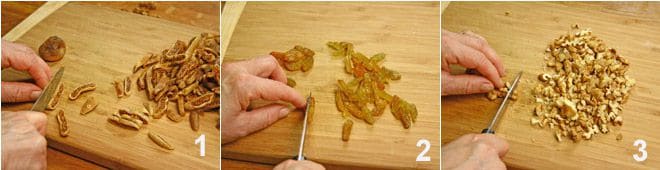 Commencez l'exécution du zelten par la préparation des fruits secs: coupez les figues en lamelles 1, les raisins malaga en deux 2 et hachez grossièrement une partie des noix 3.
