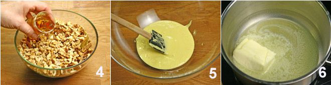 Mettez les fruits ainsi découpés dans un bol et ajoutez les raisins secs, une partie des pignons, des noisettes et ajoutez le rhum 4. Laissez macérer ainsi pendant environ une heure. Pendant ce temps, séparez les jaunes d'œufs des blancs, et battez les jaunes avec la moitié du sucre jusqu'à ce qu'ils deviennent clairs et mousseux 5 et faites fondre le beurre dans une casserole 6.