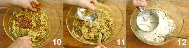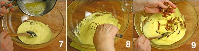 Ajoutez ensuite le beurre fondu aux œufs, mélangez bien 8. Incorporez ensuite les fruits secs au mélange en remuant continuellement 9.