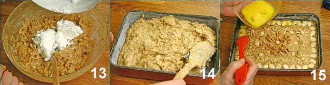 À part, montez les blancs d'œufs en neige avec l'autre moitié du sucre et incorporez le mélange à la pâte 13. Prenez un moule rectangulaire (20x25 cm), beurrez-le et farinez-le, versez-y la pâte et répartissez-la bien à l'aide d'une spatule 14. Avant d'enfourner, décorez le zelten avec des amandes, des pignons, des noix et des noisettes.