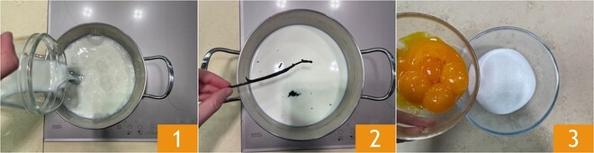 Pour préparer les zeppole aux deux crèmes, commencez par réaliser la base de la crème pâtissière : chauffez le lait dans une casserole 1 et aromatisez avec la gousse de vanille et les graines extraites 2, laissez frôler l'ébullition. Pendant ce temps, dans un bol, versez le sucre et les jaunes d'œufs 3.