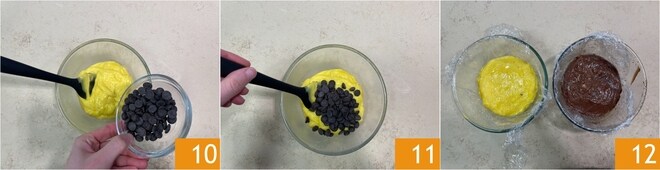 Dans l'un des deux, versez le chocolat, en morceaux ou râpé, 10 et mélangez immédiatement 11. À ce stade, couvrez avec un film plastique au contact et laissez refroidir complètement au réfrigérateur 12.