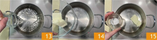 Pendant ce temps, passez à la préparation des zeppole en commençant par la pâte à choux. Dans une casserole en acier à fond épais, versez l'eau 13, le beurre 14 et le sel 15. Allumez le feu et laissez chauffer.