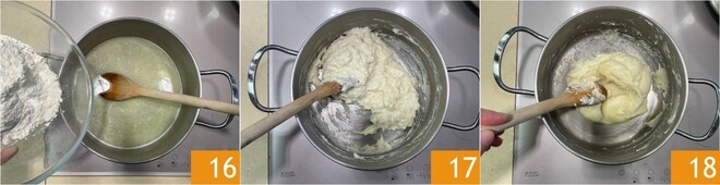 Lorsque le beurre est fondu, versez la farine d'un coup 16 et mélangez immédiatement avec la cuillère 17. Faites cuire pendant 1 à 2 minutes ou jusqu'à ce que le mélange nappe le fond et devienne une masse compacte 18.