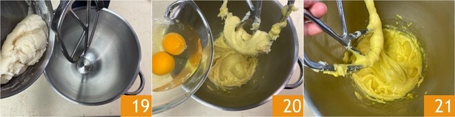 Versez la pâte dans le robot pâtissier 19, si vous n'en avez pas, vous pouvez utiliser un batteur électrique, et en actionnant la feuille, ajoutez un œuf à la fois 20. Travaillez jusqu'à ce que le mélange devienne compact et moelleux 21.