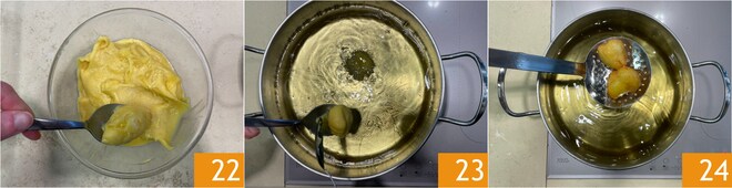 Avec la cuillère trempée dans l'huile chaude, prenez une portion de pâte 22 et versez dans la casserole où vous avez chauffé l'huile à 160° 23. Cette température permettra aux zeppole de dorer en surface et de cuire à l'intérieur en 4 à 5 minutes 24. N'oubliez pas de cuire quelques pièces à la fois.