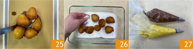 Au fur et à mesure, égouttez sur du papier absorbant 25 et lorsque vous aurez terminé, en obtenant environ 30 zeppole, roulez dans un bol avec le sucre 26. Les crèmes devraient être froides, remuez-les énergiquement avec un fouet avant de les transférer dans deux poches à douille avec une pointe pour perforer les zeppole 27.