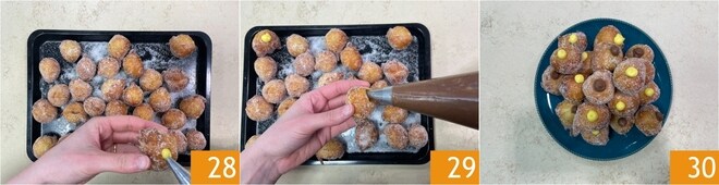 Procédez ensuite en remplissant une moitié avec la crème claire 28 et l'autre avec la crème foncée 29. Voici vos zeppole aux deux crèmes prêtes 30.